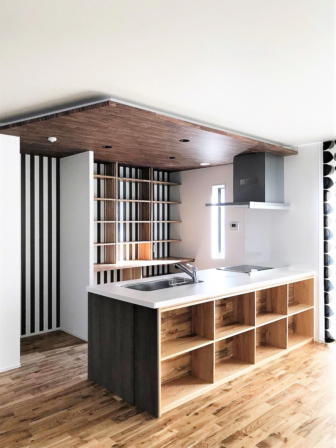 開放的なリビングとウッドデッキのある家