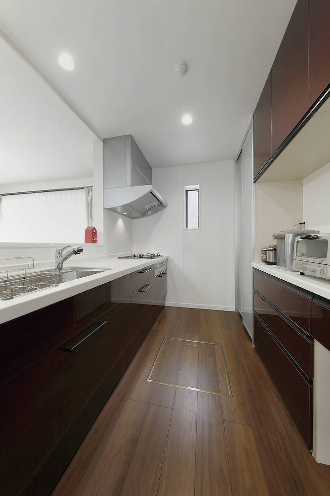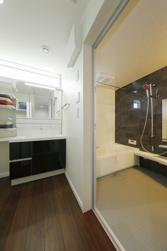 キッチンや洗面室などの水まわりは奥さまのご要望を汲んで広めにしたほか、収納スペースも充分な広さを確保しました。またキッチンのパネルやリビングのソファーなど、印象的な色づかいは、お二人の感性でチョイスされています♪