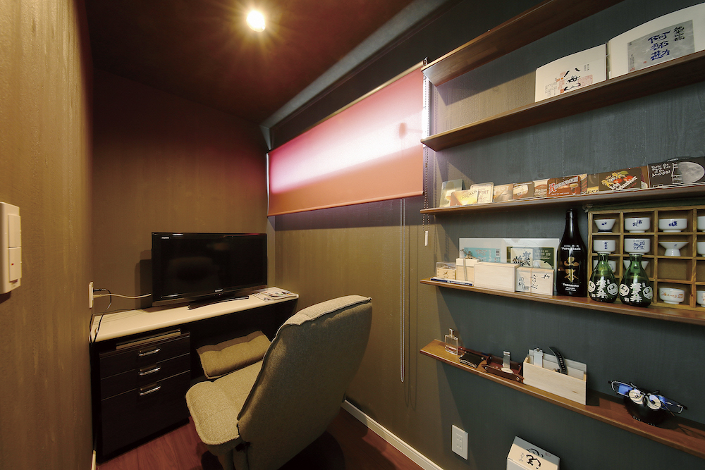 そして最も特徴的なのが、リビングの一角にこしらえた1.5帖ほどのスペースです。こちらの部屋は、日本酒好きのご主人が日本酒を楽しんだり、テレビを観たり、本を読んだりできる空間です。壁には日本酒やおちょこなどをディスプレイできる棚を設置しました。こうした造作ができるのは、専属の大工さんがいるからこそです。