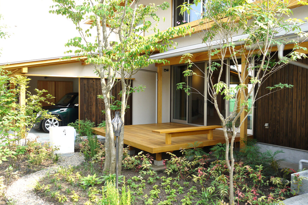 • ウッドデッキとの連続性: リビングの床とウッドデッキの高さを揃え、大きな掃き出し窓でつなげる。