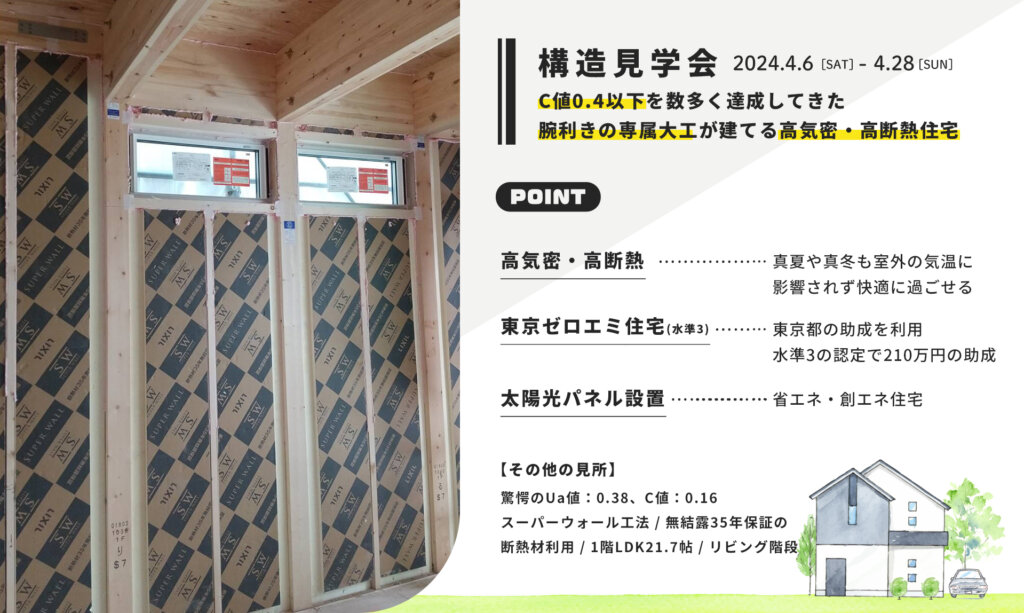 この度、現在青梅市で建設中の新モデルハウスの見学会を開催します。「33坪のC値0.16の驚愕の性能を持ったスーパーウォール工法の家」が誕生。C値0.4以下を数多く達成してきた腕利きの専属大工が建てる高気密・高断熱住宅の中でも特に高性能なモデルハウスの構造見学会は必見です!