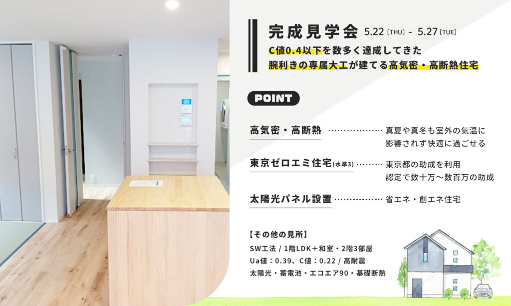 このお家は、住宅性能が「Ua値0.39、C値0.22」と実現できる工務店がとても少ないくらいの高性能(ZEHを大幅に上回る高性能)のお家です。約33坪の広さの中で1階LDK+和室・2階3部屋の見応えのある間取りです。 住宅の性能は超気密・高断熱・高耐震、さらに数少ない「東京ゼロエミ住宅」の最高水準にも認定された家です。 当日はそれらに関する質問やご相談もお気軽にお問い合わせください。