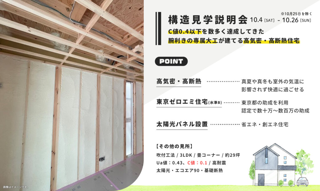 この度、八王子市で約29坪吹付工法の家の見学会を開催します。「C値0.1の驚愕の性能を持った高気密の家」が誕生。腕利きの専属大工が建てる超気密・高断熱住宅の中でも特に高性能なお家の見学会は必見です!