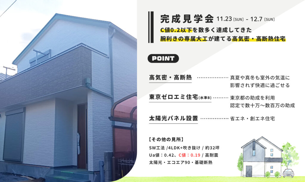 この度、国分寺市で約32坪で4LDK+吹き抜け、SW工法(スーパーウォール)のお家の完成見学会を開催します。「C値0.19の驚愕の高気密の家」が誕生。腕利きの専属大工が建てる高気密・高断熱住宅の中でも特に高性能なお家の見学会は必見です!