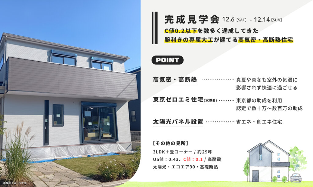 このお家は、住宅性能が「Ua値0.43、C値0.1」と実現できる工務店がとても少ないくらいの高性能(ZEHを大幅に上回る高性能)のお家です。約29坪の広さの中で3LDK+畳コーナーの2階建ての見応えのある間取りです。 住宅の性能は超気密・高断熱・高耐震、さらに数少ない「東京ゼロエミ住宅」の水準Bにも認定された家です。 当日はそれらに関する質問やご相談もお気軽にお問い合わせください。