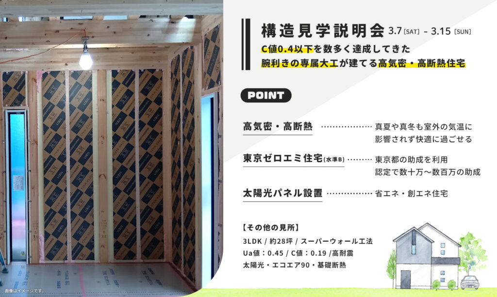 このお家は、住宅性能が「Ua値0.45(高断熱)、C値0.19(高気密)、エネルギー削減率41%」と実現できる工務店がとても少ないくらいの高性能(ZEHを大幅に上回る高性能)のお家です。約28坪の広さの中で3LDKにファミリークローゼットがある間取りは魅力的です。 住宅の性能は超気密・高断熱・高耐震、さらに数少ない「東京ゼロエミ水準B」も認定された家です。 当日はそれらに関する質問やご相談もお気軽にお問い合わせください。