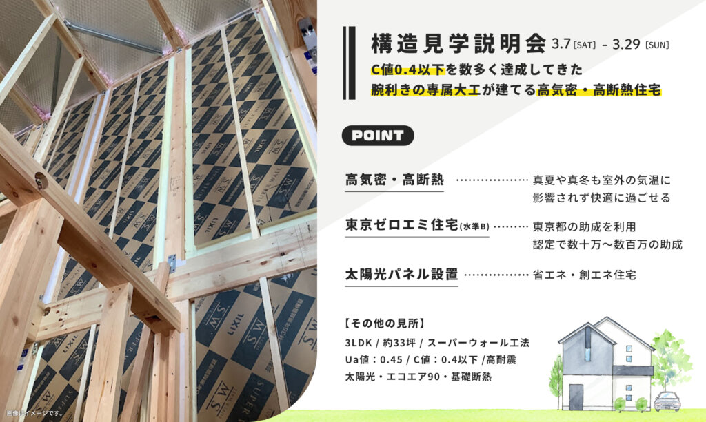 この度、東村山市で約33坪、SW(スーパーウォール)工法の家の見学会を開催します。腕利きの専属大工が建てる超気密・高断熱住宅の中でも特に高性能なお家の見学会は必見です!