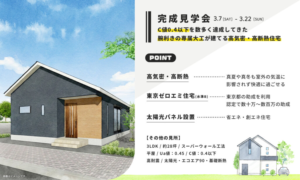 この度、八王子市で約28坪の平屋で3LDK、スーパーウォール工法のお家の完成見学会を開催します。「C値0.4以下の高気密の家」が誕生。腕利きの専属大工が建てる高気密・高断熱住宅の中でも特に高性能なお家の見学会は必見です!