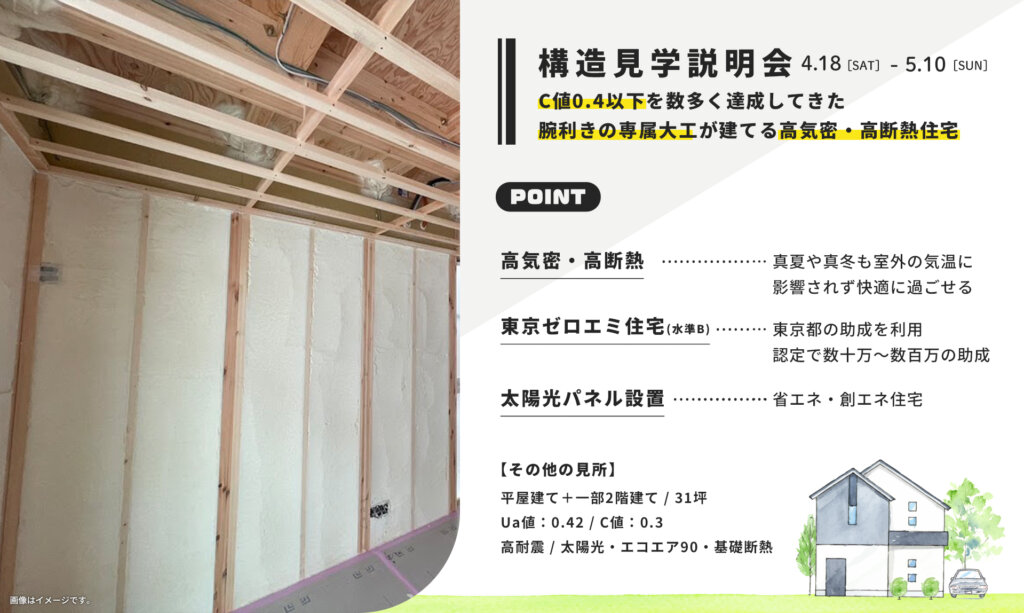 この度、青梅市で約31坪、吹付断熱の家の見学会を開催します。腕利きの専属大工が建てる超気密・高断熱住宅の中でも特に高性能なお家の見学会は必見です!
